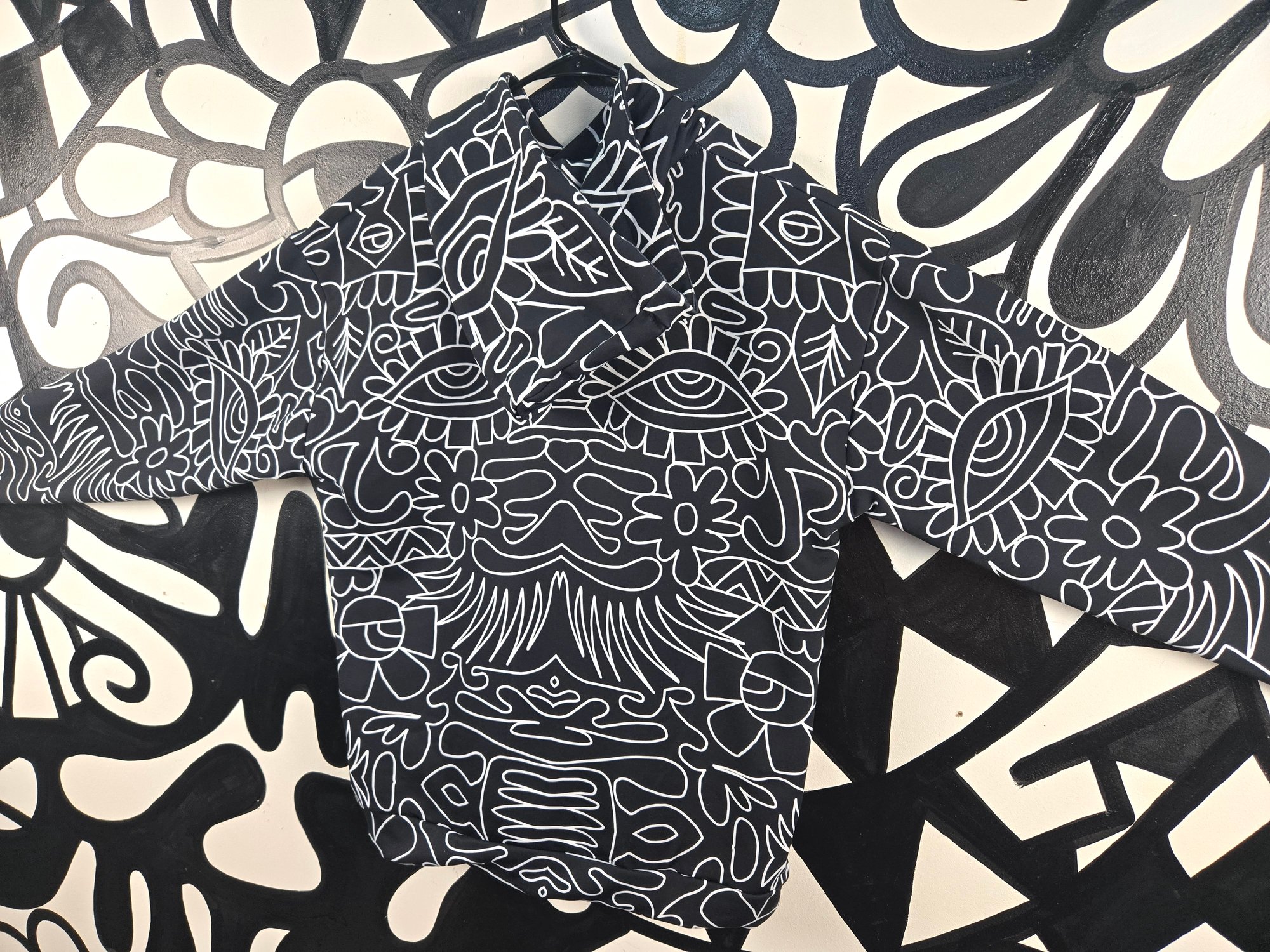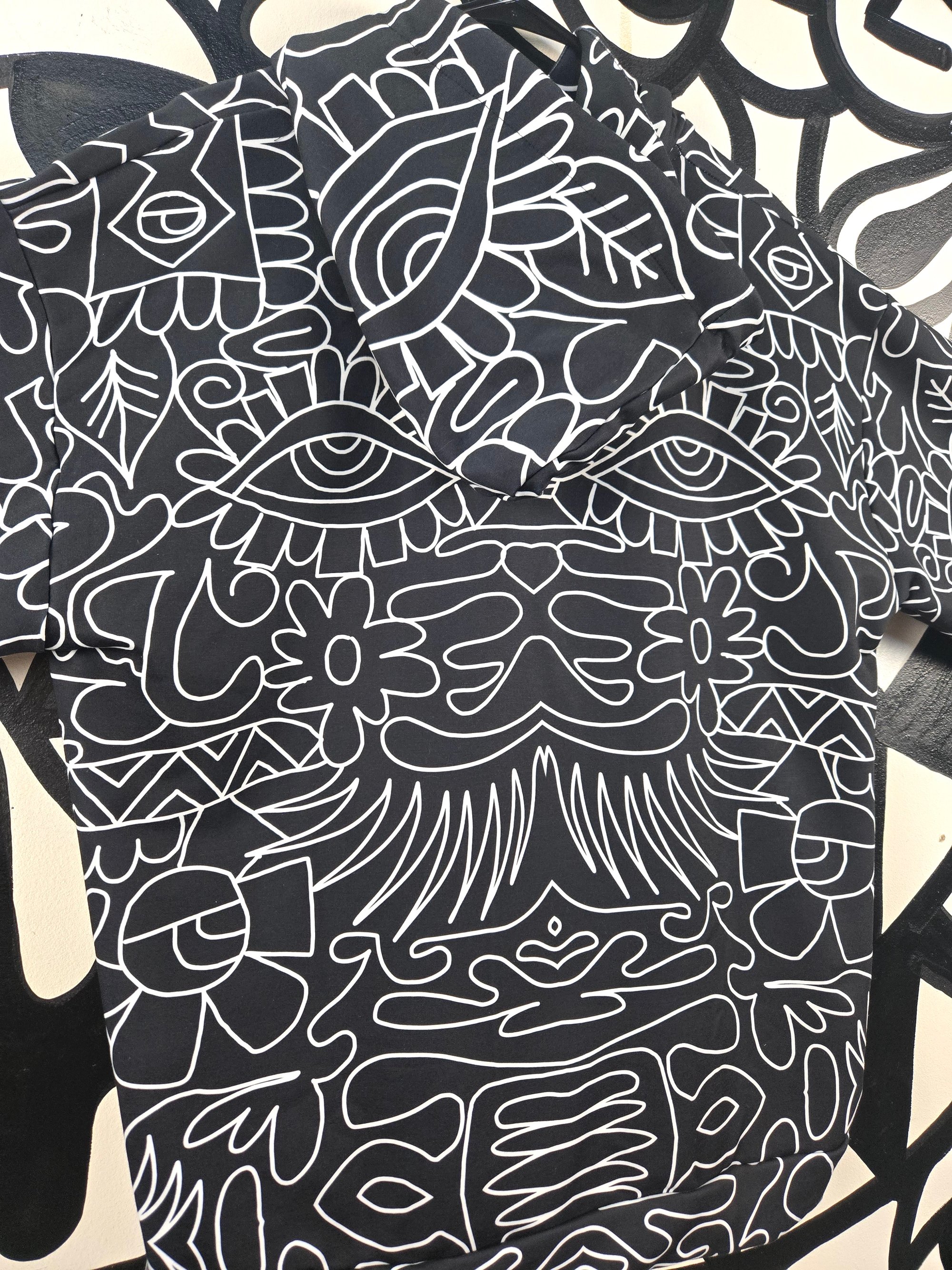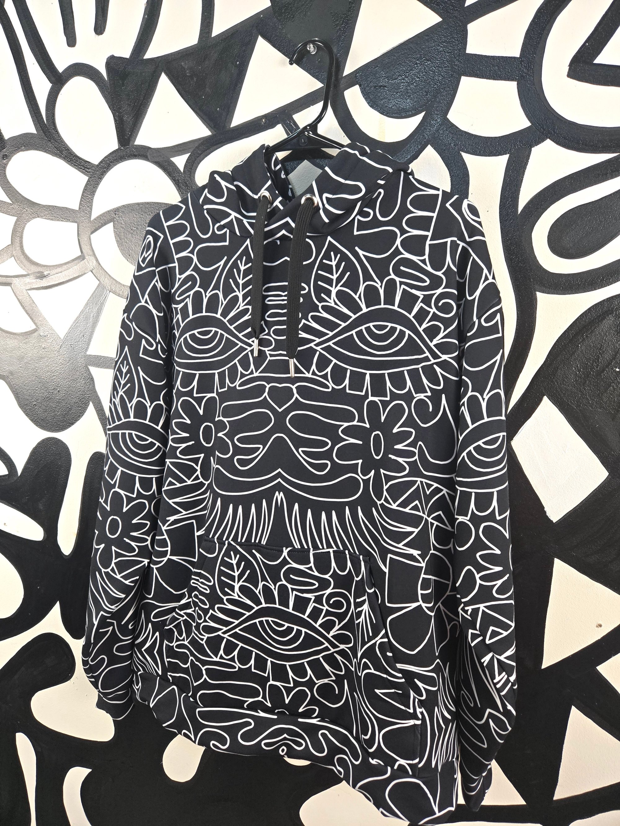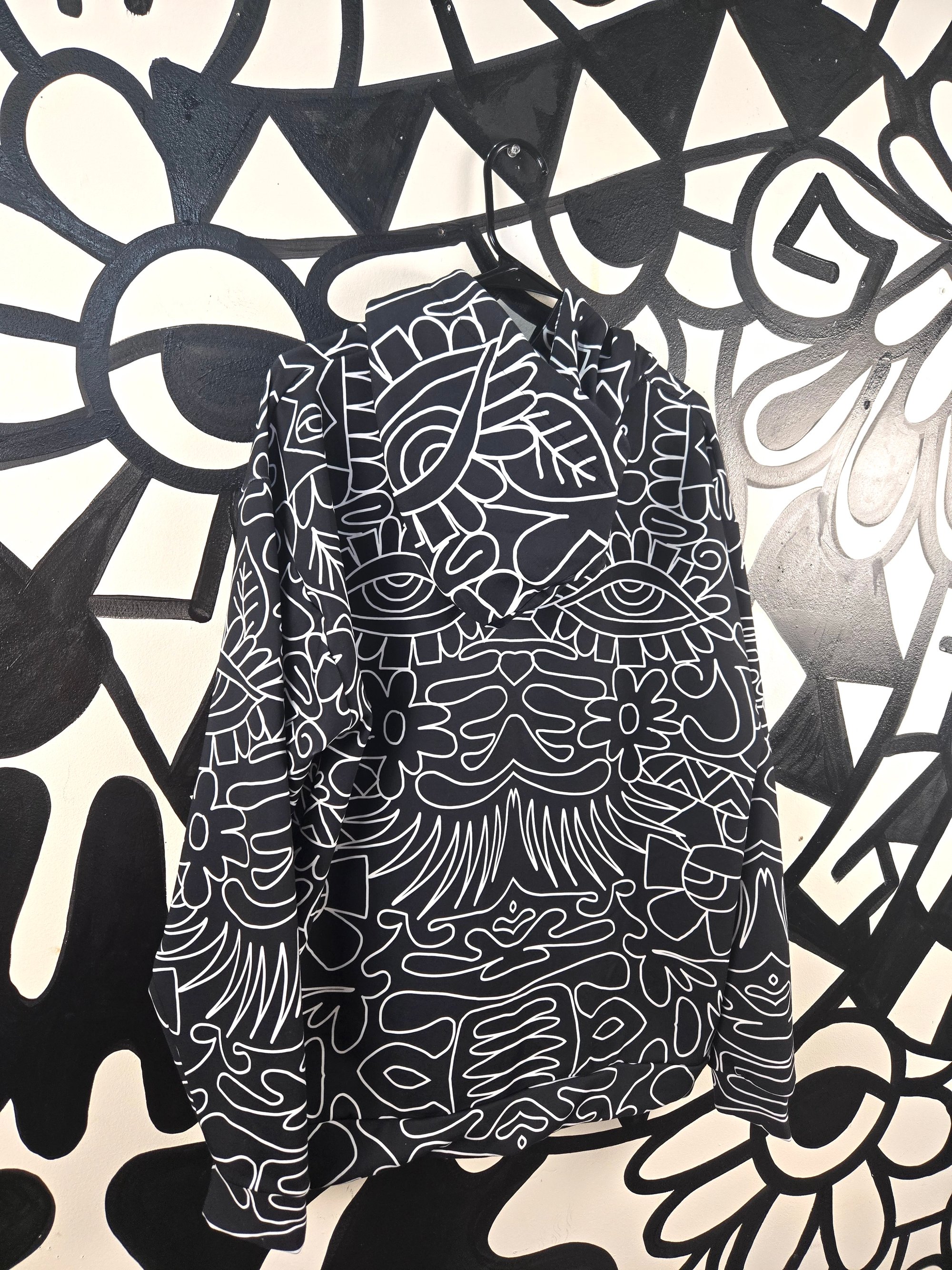 All over printed Geometric Vibes Black And White hoodie. Super cozy fit. Sublimation dye printing. 95% recycled polyester. 5% spandex. Machine wash cold. Made in Mexico of Imported Fabrics. Ships within 4 weeks of ordering.