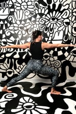 Modeled by Carrie of Kismet Wear. All-Over Print Recycled Leggings with Pockets. 74% recycled polyester, 26% elastane. Tight fit. Flattering cut. High-waisted. 1 pocket on each side.