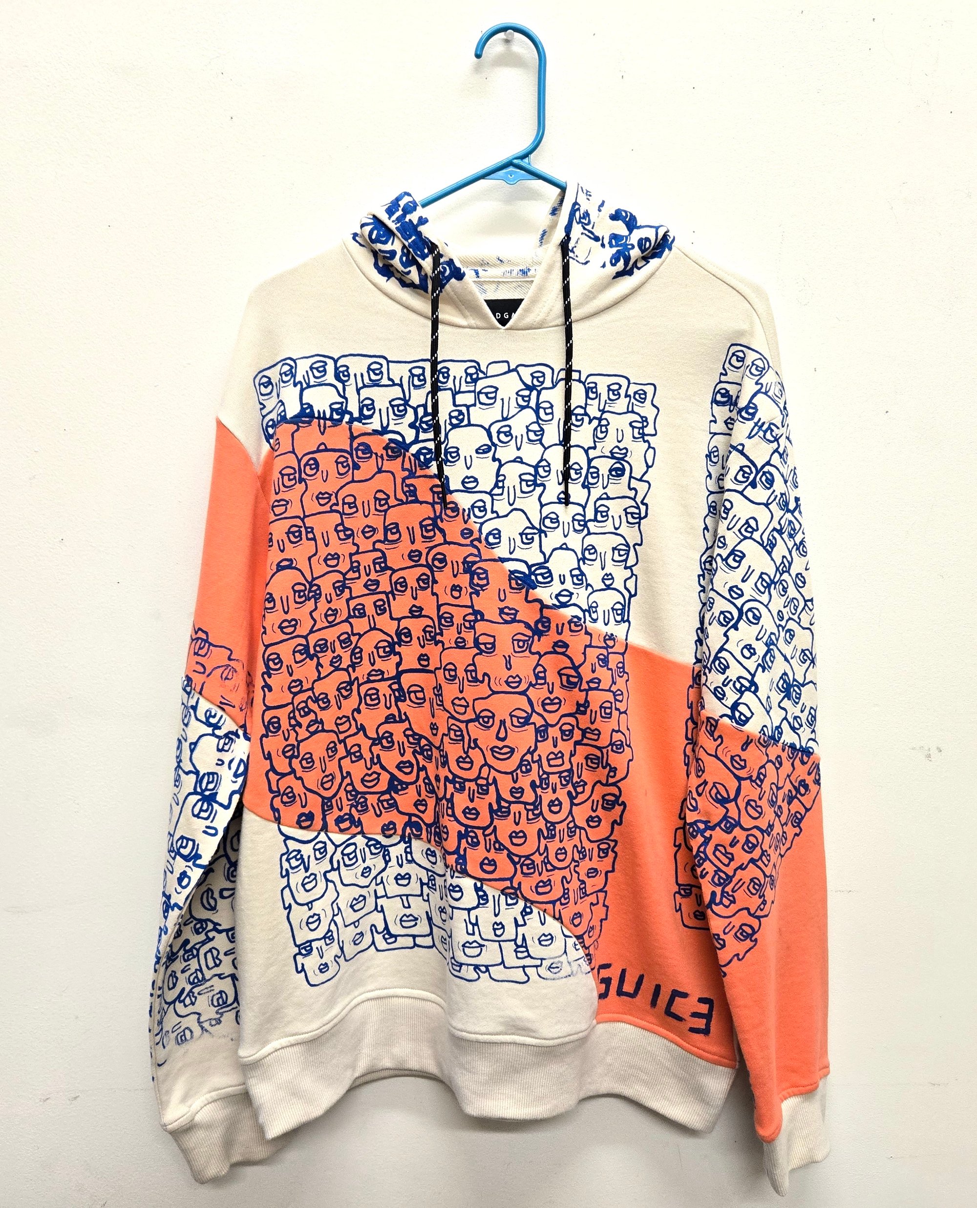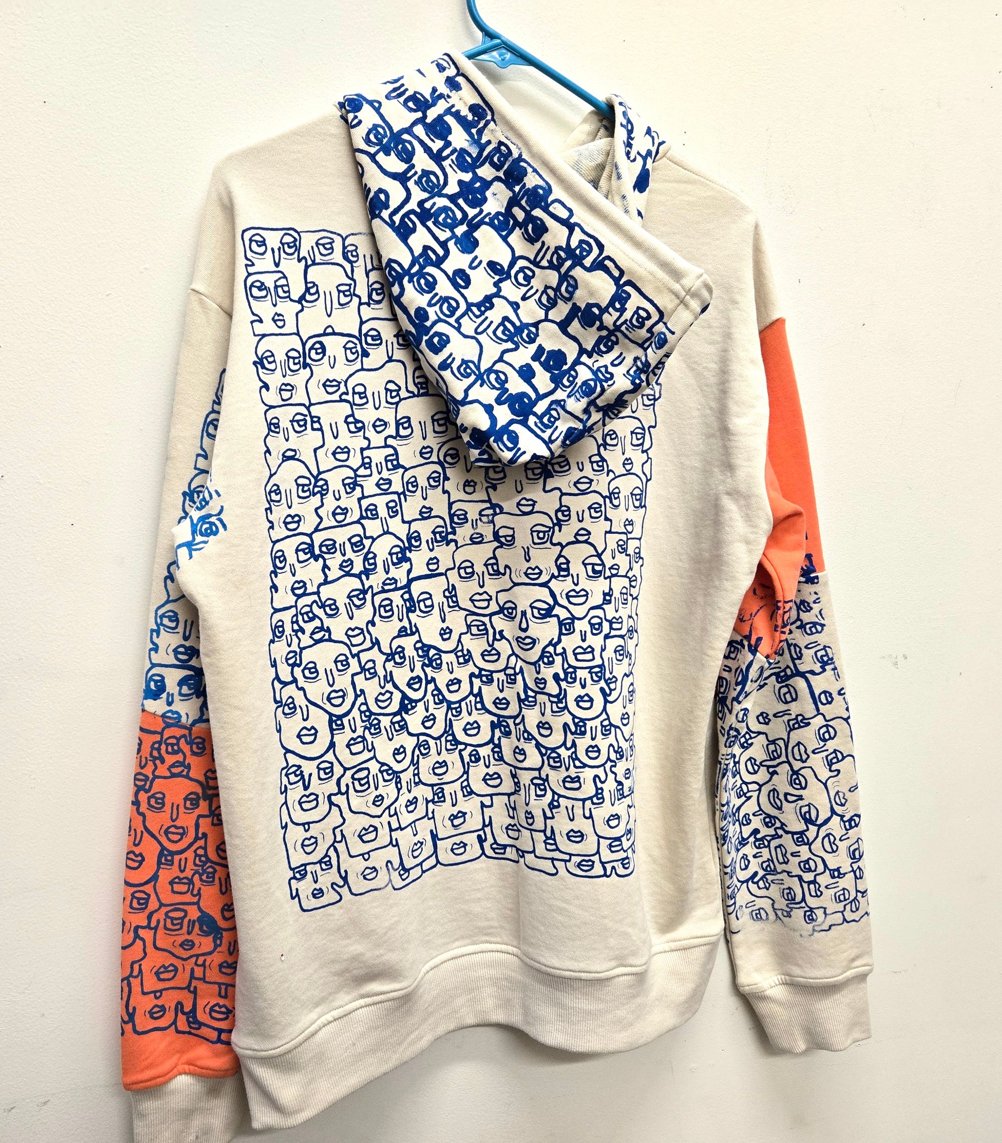 Size Medium Faces Hoodie Orange and White 1 of 1 hand screen printed by me. Machine wash cold and hang dry. 60% cotton 40% polyester. Edgar and Ash hoodie.